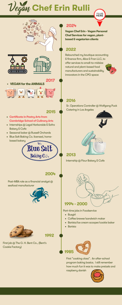 As a plant-based personal chef, Erin enjoys preparing fresh, delicious meals, snacks and desserts for individuals, couples and families that are interested in seasonal, homemade food that’s better for people, the planet and our animal friends. From the initial consultation through kitchen clean up, Erin provides a personalized experience that reflects her clients’ taste preferences, dietary restrictions and lifestyle. With a recipe repertoire that spans from vibrant, healthy bowls and kid-friendly snacks to comfort food favorites and indulgent desserts, Chef Erin wants to make your life easier, your fridge full and your family happy and well-fed.