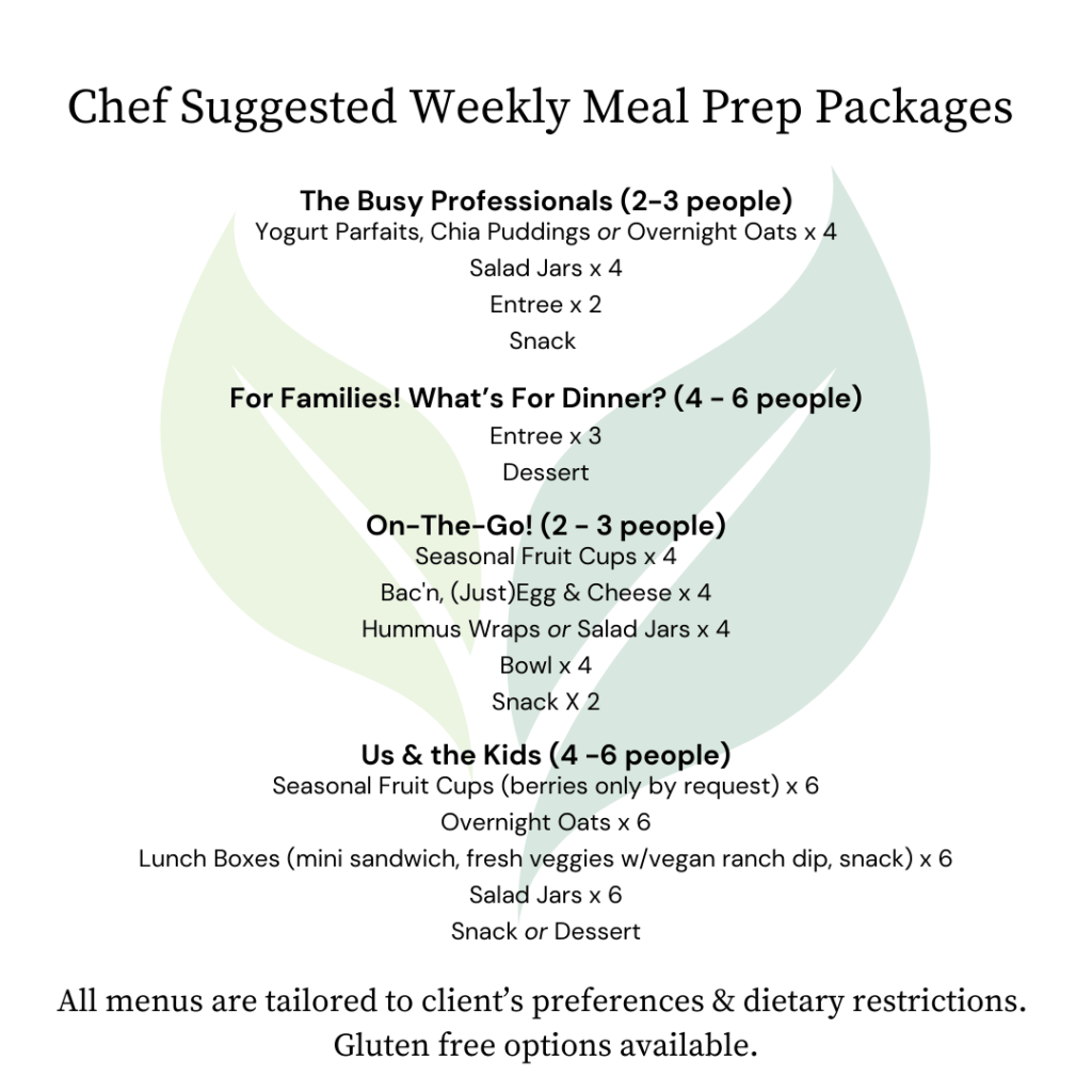 I specialize in one service; in-home/on-site, plant-based meal prep. Clients can choose weekly, bi-weekly or short-term meal prep depending on your needs.